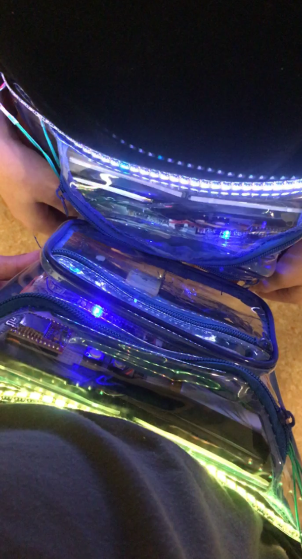 Alert My Friends: If you're inactive for a long period of time (the IMU detects little to no movement), the LitBit will ask you if you're okay. If you don't respond, your fanny pack will flash red to alert others around you, as well as notify your other LitBit wearing friends through the WiFi module.